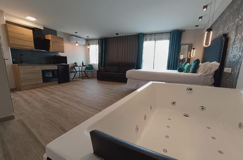 Die Unterkunft Airen Suites ist in Chinchón gelegen, 29 km von Themenpark Parque Warner Madrid und 44 km von Reina Sofia Museum entfernt. Sie bietet kostenloses WLAN sowie Zugang zu einem Whirlpool. Die Unterkunft bietet einen Whirlpool. Die Unterkunft ist ausgestattet mit einer Klimaanlage, einer voll ausgestatteten Küche mit einem Essbereich, einem Flachbild-TV und einem eigenen Badezimmer mit einer Badewanne oder Dusche, kostenlosen Pflegeprodukten und einem Haartrockner. Es gibt einen Kühlschrank, eine Mikrowelle, eine Herdplatte sowie eine Kaffeemaschine. Bahnhof Madrid Atocha liegt 44 km von der Unterkunft Airen Suites entfernt, während Parque Retiro 45 km entfernt ist. Der nächstgelegene Flughafen ist der Flughafen Madrid-Barajas, 53 km von der Unterkunft Airen Suites entfernt.