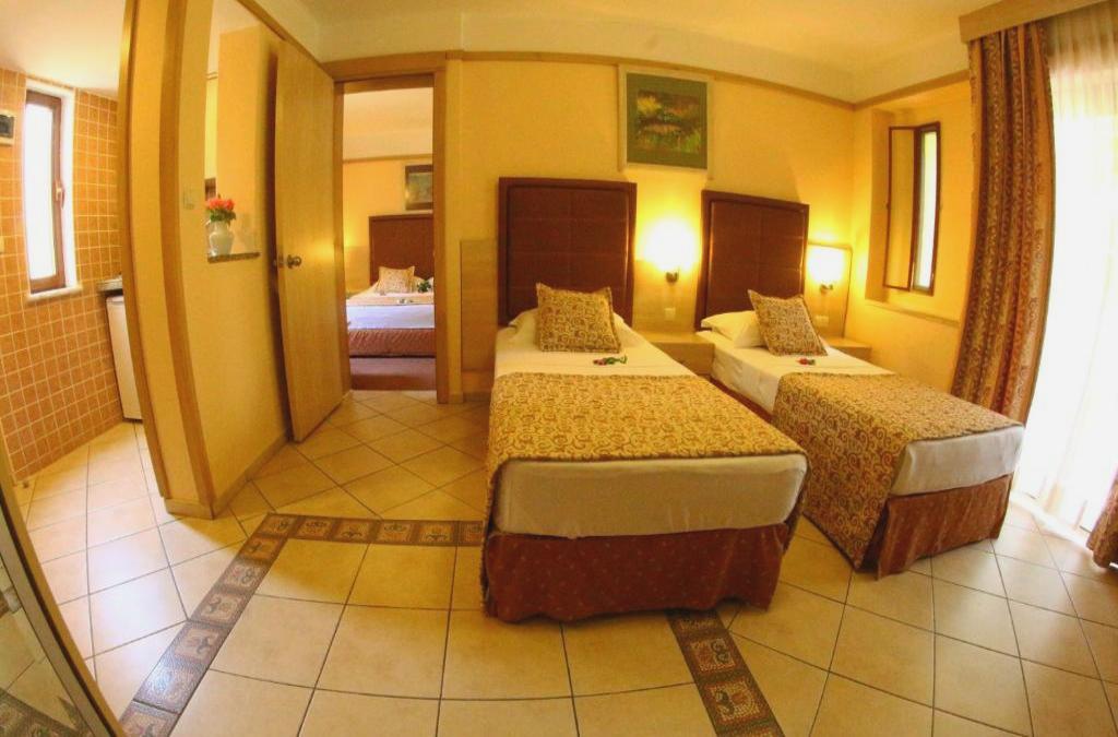 This holiday complex, located in Colakli on a long sandy beach 9 km from the resort and the historic town of Side, is about 500 m from the center of Colakli and its stores, restaurants, bars and nightlife. There are public transport stops on the main road, 150 m from the bungalow complex, and the beach is just 30 m away. Other nearby attractions include Manavgat 8th 15 km), the Aspendos amphitheater (11 km) and the Manavgat waterfalls (18 km). Antalya airport is approximately 55 km from this family-friendly beach hotel. This spacious, family-oriented holiday complex has 632 rooms set in ground-floor blocks on attractive grounds. Guests are welcomed in a modern lobby with 24-hour reception and check-out service, and there is also an auditorium, hairdressing salon, games room, TV room, safe and currency exchange facilities. Children can have fun in the children's playground or kids' club. There is a main restaurant and, during the summer months, there are other restaurants offering a wide selection of cuisine. Guests can enjoy a drink at the bar or at the on-site discotheque. Wi-Fi Internet access, laundry service (surcharge) and car park are available at this air-conditioned hotel. The remodeled rooms are equipped with a private bathroom with shower, bathtub and hairdryer, double bed, kitchenette with a small fridge and private balcony or terrace. Other amenities include adjustable air conditioning and heating, satellite TV, a hire safe and a direct dial telephone.