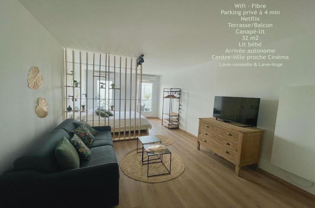 ALP Chartres - Grand studio avec terrasse et parking, que tiene vistas a la ciudad, ofrece alojamiento con balcón y cafetera, y está a unos 15 min a pie de Estación de tren de Chartres. El alojamiento, que está a 4 min a pie de Teatro Municipal de Chartres, dispone de terraza y parking privado gratis. Este apartamento dispone de 1 dormitorio, cocina con nevera y lavavajillas, TV de pantalla plana, zona de estar y 1 baño con ducha. Hay toallas y ropa de cama en el apartamento. Se puede practicar senderismo en los alrededores. Catedral de Chartres está a 8 min a pie del alojamiento, y Estación de tren de Dreux está a 36 km. El aeropuerto (Aeropuerto de París - Orly) está a 73 km.