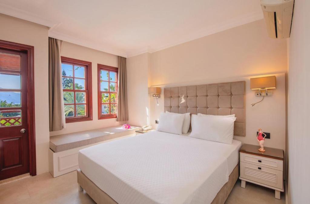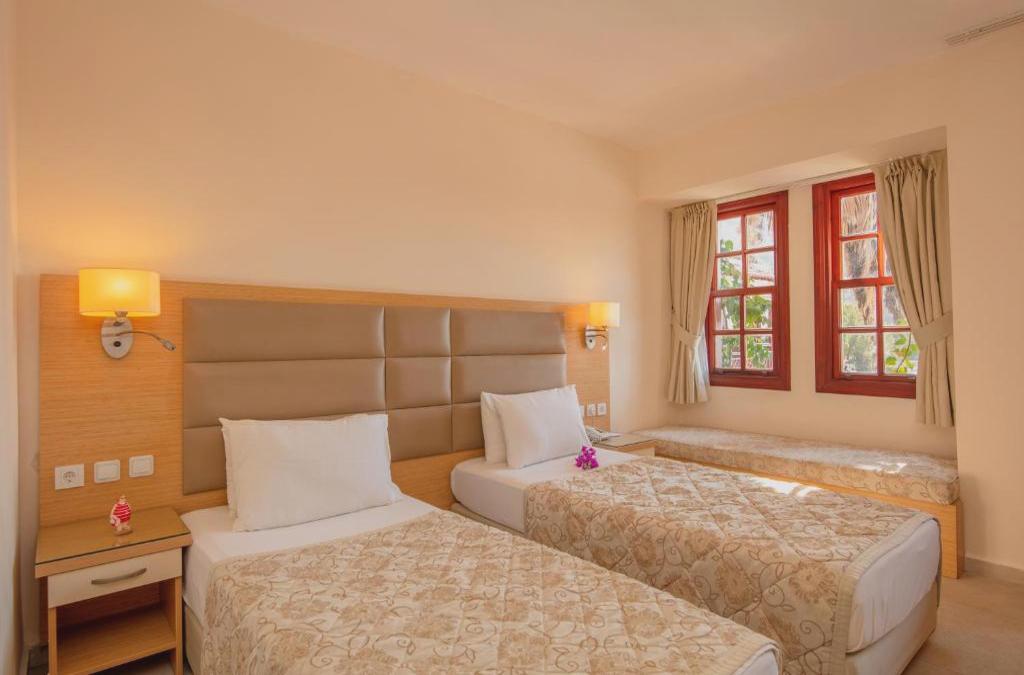 Ce bel hôtel de bord de mer est situé dans la zone touristique, à proximité de Fethiye et à quelques minutes à pied (environ 350 mètres) d'une belle plage et de la mer turquoise. Il y a un arrêt de transport en commun à environ 50 mètres de l'hôtel. Dans les environs, à environ 100 mètres, vous trouverez un large éventail de boutiques et d'entreprises, ainsi que de nombreux restaurants, divers bars, pubs, cafétérias et un grand nombre de lieux de loisirs et de divertissement. Au coin de la rue, à seulement 100 mètres, il y a aussi une discothèque. La belle plage de galets d'Öludeniz est à environ 400 mètres. Vous pouvez facilement rejoindre le magnifique centre de Fethiye (à une distance de 14 kilomètres) en voiture ou avec un minibus (bon marché). Il y a un service de bus gratuit depuis l'hôtel lui-même qui va à la plage. L'aéroport de Dalaman est à environ deux heures de route. Cet hôtel moderne est réparti sur 7 étages et compte en tout 62 chambres doubles. Il dispose d'un hall d'entrée avec ascenseur et d'une réception ouverte 24h/24 proposant un coffre-fort et un service de change.. A disposition des hôtes il y a un petit marché, un coiffeur, un bar, un amphithéâtre, une salle de jeux, une salle TV, un restaurant en plein air et un autre à l'intérieur du bâtiment (dont un à la carte et climatisé). Enfin, vous pourrez profiter de la salle de conférence, de la borne Internet (gratuite), des services de chambre, de blanchisserie, de soins médicaux et du parking, ainsi que d'un club enfants (service de baby-sitting sur demande et en supplément) et d'un parc pour que les enfants jouent. Les chambres confortables disposent d'une salle de bain avec douche et sèche-cheveux, d'une ligne téléphonique directe, de la télévision par satellite, de la climatisation et d'un coffre-fort à louer. De plus, les chambres, meublées et décorées avec beaucoup de goût, disposent d'un balcon ou d'une terrasse.
