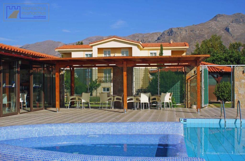 Il complesso residenziale si trova sulla baia di Fragokastelo a Sfakia. La fortezza della città e il mare sono a 300 m di distanza. A 300 m di distanza si trova il centro di Fragokastelo, oltre a numerosi ristoranti, bar, negozi e una fermata per i mezzi pubblici. Questo complesso di appartamenti, inaugurato nel 2005, dispone di 18 appartamenti individuali e 4 monolocali divisi in 3 gruppi. Gli appartamenti e i monolocali si trovano su 1 ettaro di terreno con erba, piante e fiori. Ha un ingresso, un piccolo supermercato, una sala giochi e noleggio biciclette. Ogni mattina agli ospiti viene offerta la colazione nella caffetteria. C'è anche un parco giochi per bambini. Il servizio medico e il parcheggio completano tutti questi servizi. 14 degli appartamenti possono ospitare 4 o 5 persone e dispongono di 2 camere da letto e un soggiorno. 4 degli appartamenti sono per 2 persone e dispongono di una camera da letto e un soggiorno. I 4 monolocali sono per 2 persone. Tutti i monolocali e gli appartamenti dispongono di bagno con asciugacapelli, telefono con linea diretta, TV via satellite o via cavo, angolo cottura, frigorifero, forno, finestre doppie, set per la preparazione di tè e caffè, letto a due piazze e cassetta di sicurezza a pagamento. Hanno anche un ampio balcone con vista sulla fortezza, sul mare e sulle montagne. Gli appartamenti per 2 persone dispongono di 3 dispositivi di climatizzazione, uno in camera da letto, uno in soggiorno e uno in cucina. Il resto degli appartamenti dispone di aria condizionata regolabile per l'intero appartamento. 6 degli appartamenti dispongono di 2 camere da letto con riscaldamento centralizzato. Su richiesta dell'ospite è possibile installare una culla.