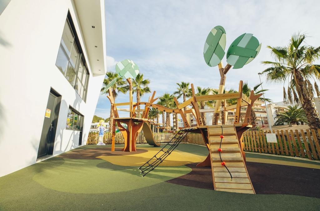 Hotel para los niños súper bueno. Es como estar de camping. Los niños jugando en una zona ajardinada muy grande y una súper piscina con toboganes y el concepto de villas. Muy chulo