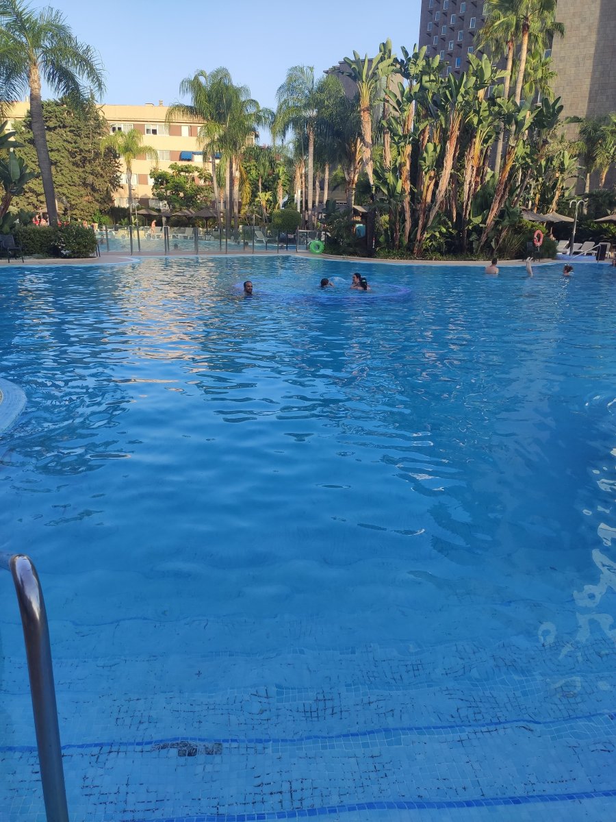 Mi experiencia no ha sido buena. El hotel se encuentra masificado, colas para todos, en realizar el check-in tardamos más de hora y media, luego el comedor, abarrotado de gente, cuesta trabajo coger mesa, y tardan a veces en reponer bandejas. Las habitaciones son anticuadas, con gotelé, la mía para tres era muy pequeña y solo tenía 2 enchufes, uno en la habitación y otro en el baño. Si quieres coger hamaca en la piscina, es misión imposible, salvo que te levantes a las 7 de la mañana y te pongas a hacer cola para que cuando abran, puedas pillarlas. Además, yo iba en pensión completa y he tenido que pagar hasta por el agua que bebía en el comedor, y no poco, la botella de medio litro, 2'80 €, de litro no las hay, ya que los puntos de agua que hay en el desayuno, los quitan para las comidas, y como mucho, y siempre que la pidas, solo tienes la posibilidad de que el camarero te traiga un vaso de agua del grifo, natural, para que la tengas que pedir embotellada fresquita. Es gracioso porque hasta por cambiar las toallas de la piscina, te cobran 1 euro, argumentando que es por conciencia medioambiental, ahora en cambio, esa política no la aplican a las cisternas, ya que no he visto ninguna en todo el hotel que tenga sistemas de media carga para ahorrar agua, ni te facilitan agua del grifo en las comidas para que, un vehículo de combustión no tenga que venir cargado de botellas repartiendo, con la de gases contaminantes que emite. En definitiva, que este tipo de cosas suponen un ahorro para el hotel o un beneficio, aunque el cliente sea el que tenga que sufrir el perjuicio. Otra cosa igual es la política del euro por el vaso de plástico reutilizable, pero eso lo dejo que lo cuente el próximo que visite el hotel, aunque conste que estoy de acuerdo con reducir los plásticos. Por cierto, el parking 14'50 € el día.